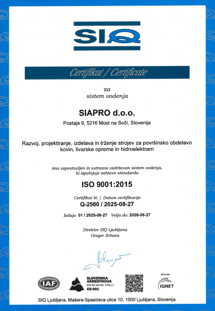 Pomembna novica iz podjetja Siapro d.o.o. V podjetju Siapro d.o.o. dajemo velik poudarek na kakovost naših proizvodov in storitev. Zato smo še posebej ponosni, da smo vzpostavili sistem vodenja kakovosti in pridobili certifikat ISO 9001:2015.